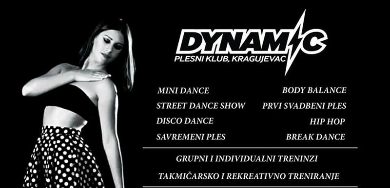 Plesni klub “Dynamic” iz Kragujevca je osnovan 2006-te godine kao jedinstven i veoma uspešan klub vođen mladim koreografima sa ambicijom da svoju ljubav prema plesu prenesu na mlađe pa i starije generacije. Iako je prošlo samo par godina od osnivanja, ovaj klub iza sebe ostavlja veliki broj uspeha na regionalnim, državnim, pa i međunarodnim takmičenjima svojim kreativnim i dinamičnim radom. Skoro sve vrste plesova su veoma negovane a kao naše glavne adute izdvajamo: disco dance, street dance show, mini dance, contemporary dance, Bboying (Break Dance), hip-hop . Od svojih koreografa su plesači mogli naučiti ono što je za ovaj vid umetnosti jako bitno, a to je ljubav prema plesu…