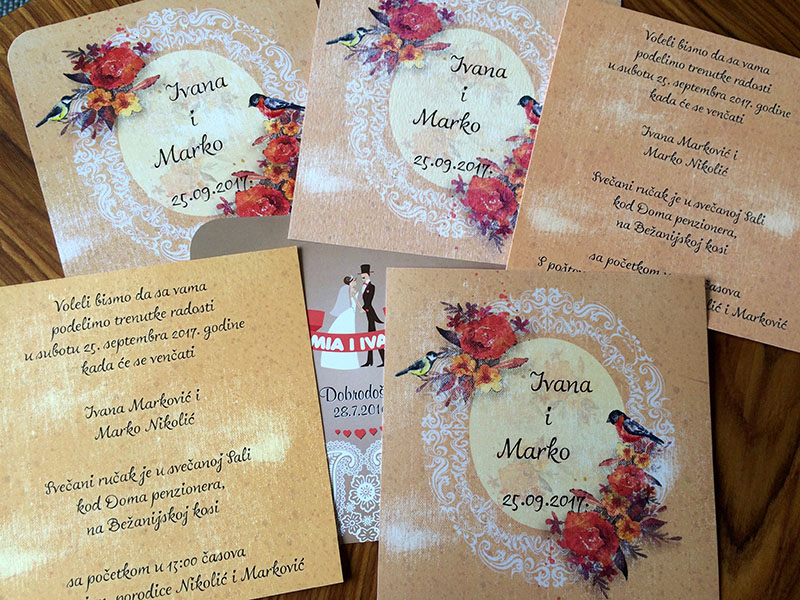 Naše pozivnice za venčanja će vaš najsrećniji dan učiniti još srećnijim, i podeliće vašu sreću svima onima koji ih dobiju. Pozivnica koja je rađena po vašim zamislima ili našem dizajnu, potpuno unikatna, oduševiće vaše zvanice i ostaće im kao divna uspomena.